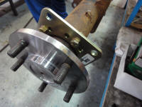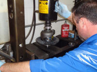 Our Baer rear brake caliper mounts installed along with the National Bearings. There is one thing I learned is don’t cheap out on bearings. If you can get OEM ones, they are better then anything else (but aren't made anymore) because they are original and designed to work perfectly with the housing. If you can’t get them get something like National, don't cheap out here at all. Once again, Rod used the shop press to install our wheel studs into our Quality Gear axles.